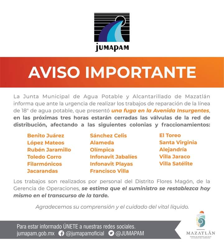 MAZATLÁN, Sin.- La Junta de Agua Potable y Alcantarillado de Mazatlán informó a la población de la reparación de una fuga de agua potable en la avenida Insurgentes.