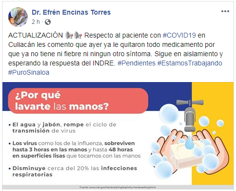 A través de redes sociales el titular de la dependencia, Efrén Encinas Torres, señaló que ayer le quitaron el medicamento al paciente al no presentar ya fiebre, ni ningún otro síntoma.