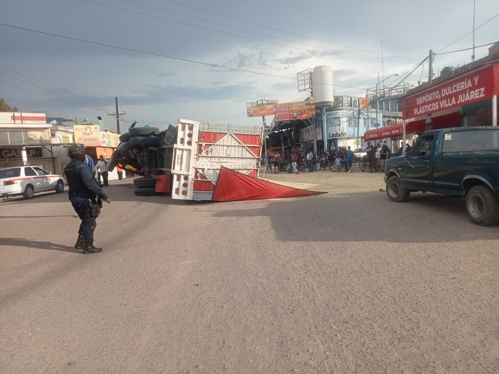 VILLA JUÁREZ, Sin.- Un camión tipo torton cargado de maiz se volcó en el acceso sur de Villa Juárez, en el mismo sitio donde sólo en lo que va del año se han presentado tres accidentes más.