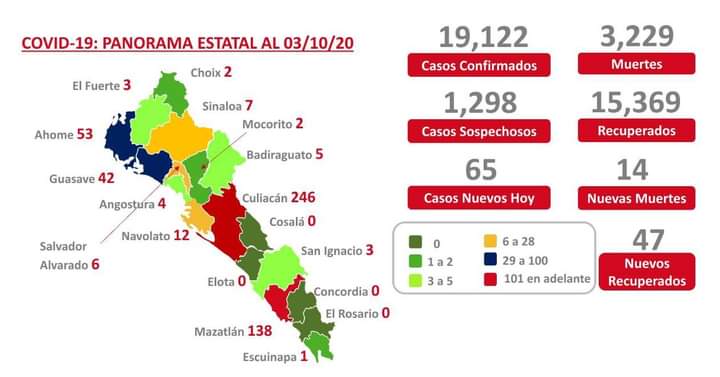 CULIACÁN, Sin.- Sinaloa reportó este sábado 3 mil 229 con 14 nuevas muertes, informó la Secretaría de la Salud.