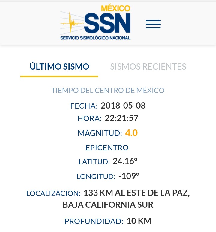 El temblor tuvo epicentro a 133 kilómetros al este de La Paz, Baja California, Sur a una profundidad de 10 kilómetros y con registro a las 21:21 horas del Pacífico Mexicano, informó el Servicio Sismológico Nacional.