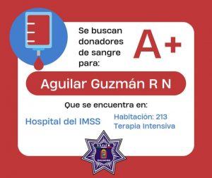 CULIACÁN, Sin.- La Secretaría de Seguridad Pública y Tránsito Municipal solicita el apoyo con donadores de sangre tipo A+, para recién nacido que se encuentra internado en Terapia Intensiva del Hospital del IMSS.