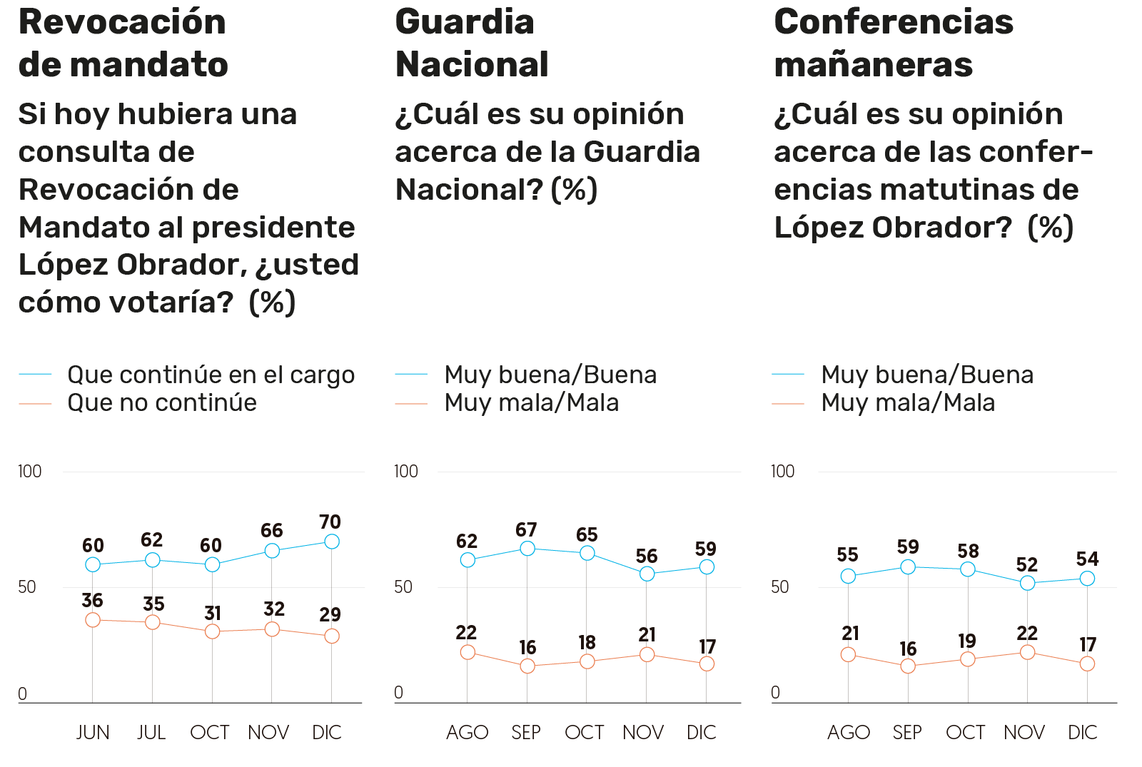 Al preguntar cómo votarían en una consulta de revocación de mandato, 70 por ciento dijo que daría su apoyo a que el Presidente continúe, el porcentaje más alto hasta ahora registrado en este indicador desde junio pasado, mientras que 29 por ciento votaría por que no continúe.