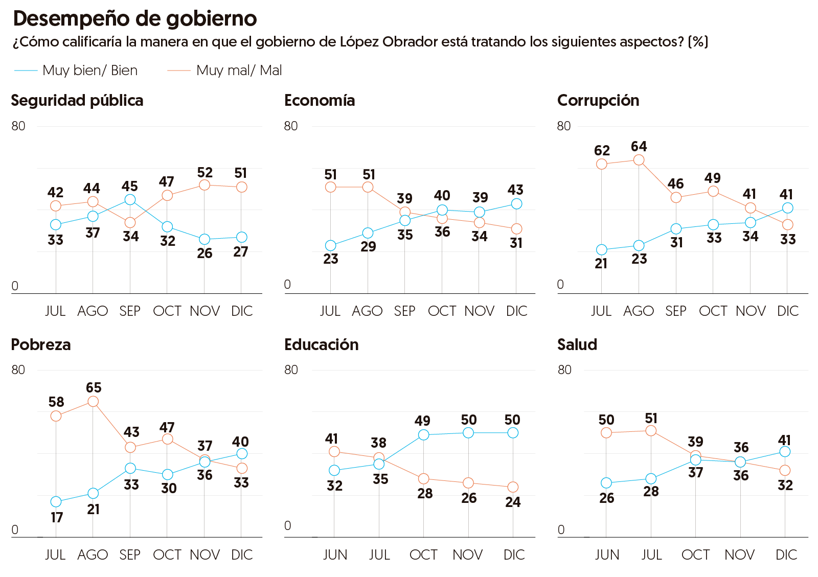 En educación se mantiene un balance positivo, con 50 por ciento de opinión favorable y 24 por ciento desfavorable, mientras que en salud también se revirtió por primera vez el balance negativo que había a principios de año, con 41 por ciento expresando hoy una opinión favorable y 33 por ciento desfavorable.