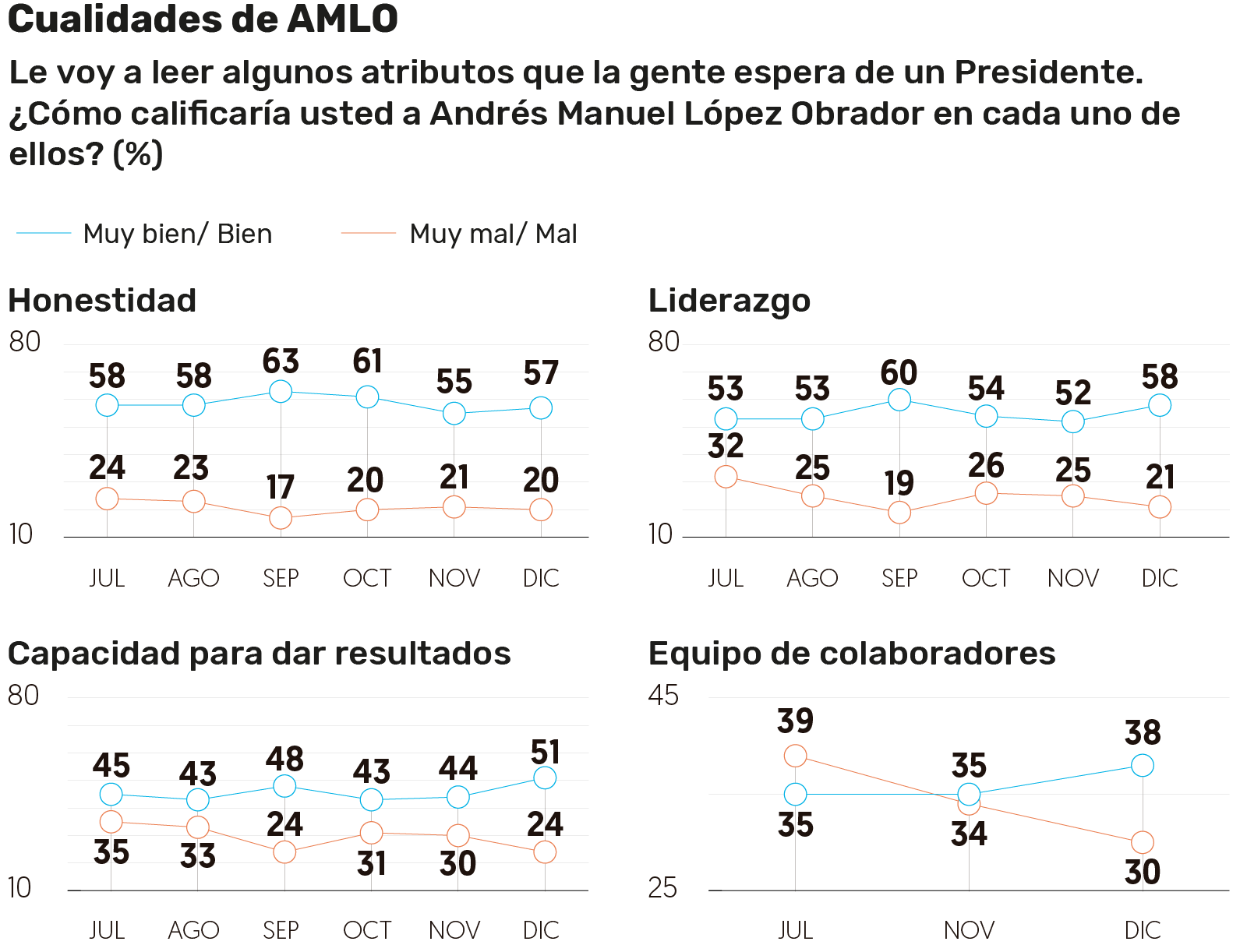 En imagen de honestidad y de equipo de colaboradores, las variaciones fueron mínimas: apenas dos puntos en honestidad, para registrar 57 por ciento, y tres puntos en la imagen de los colaboradores, para llegar a 38 por ciento.
