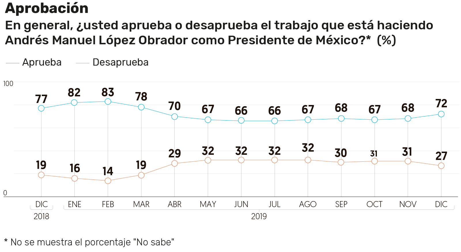 CIUDAD DE MÉXICO.- El presidente Andrés Manuel López Obrador cerró 2019 con un nivel de aprobación ciudadana de 72 por ciento, en diciembre, cuatro puntos por arriba del mes anterior, según revela la encuesta nacional de El Financiero realizada el mes pasado.