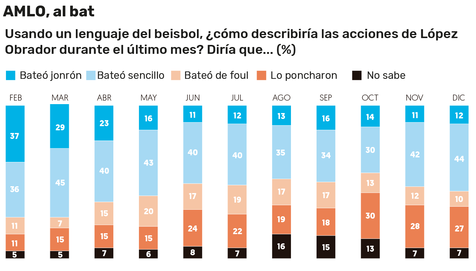 De acuerdo con el indicador beisbolero de opinión, el 56 por ciento de los entrevistados vio en diciembre batear bien al Presidente, ya sea pegando jonrones (12 por ciento) o bateos sencillos (44 por ciento).