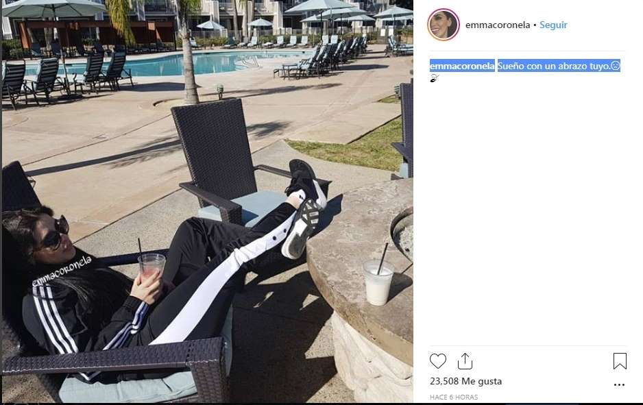 La cuenta de Instagram, emmacoronela, publicó esta tarde una fotografía de la ex reina de belleza con el mensaje “Sueño con un abrazo tuyo”.
