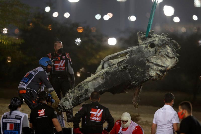 Grosjean accidentó espectacularmente su monoplaza, que se incendió, pero no sufrió daños mayores, sólo algunas quemaduras menores.