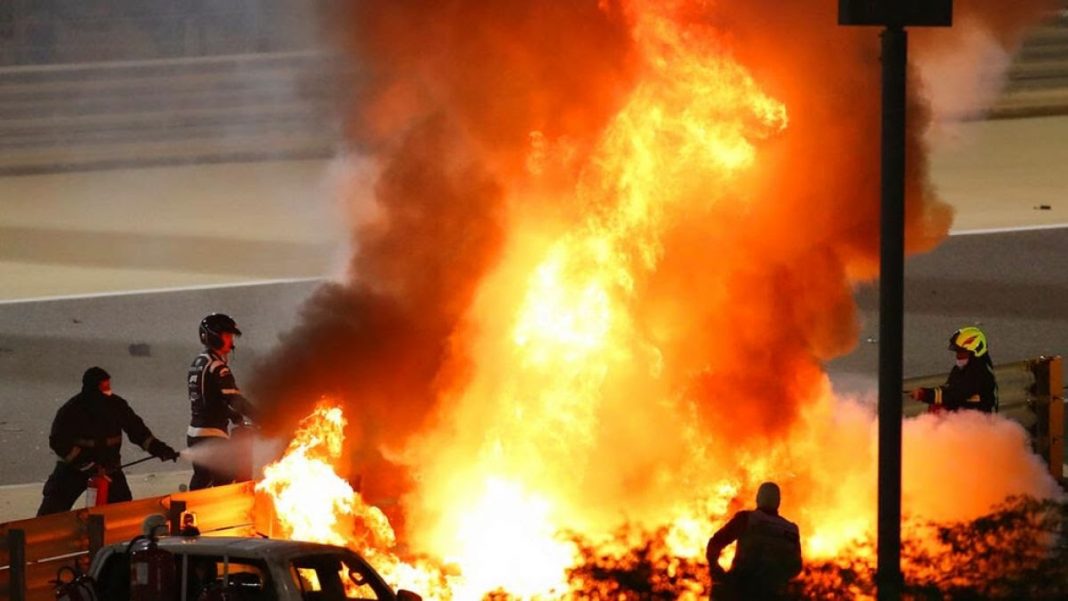 Grosjean se impactó al darse la salida y su monoplaza comenzó a incendiarse; el piloto sufrió algunas quemaduras