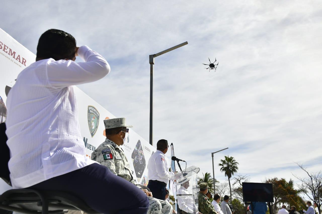 Durante su mensaje se ofreció una demostración de dos de los 12 drones que se sumarán a las actividades del operativo con vigilancia y seguridad, además de la difusión de mensajes importantes para los bañistas, como la sana distancia y el uso correcto del cubrebocas.