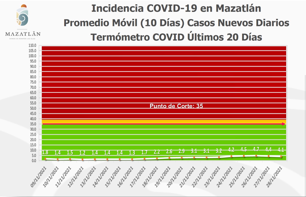 MAZATLÁN, Sin.- Desde el pasado 26 de noviembre, el puerto se ha mantenido por debajo de los 30 casos activos de Covid-19 y se mantiene en color verde del Semáforo Epidemiológico Estatal y del Termómetro del Ayuntamiento, dio a conocer Cristian Castillo López.