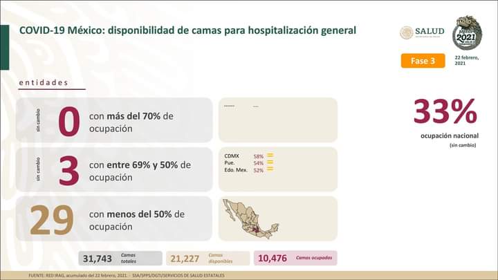 La ocupación hospitalaria de camas generales es de 33% a nivel nacional, mientras que la de camas con ventilador es de 36%.