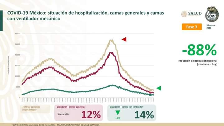 A nivel nacional, 88% de camas de hospitalización general están disponibles y 12% ocupadas. En camas con ventiladores, 86% están disponibles y 14% ocupadas por pacientes graves de COVID-19.