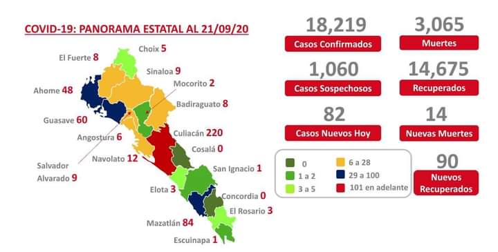 *Muertes*: 3,065 (14 nuevas. Culiacán 3, Mazatlán 2, Guasave 2, Mocorito 2, Cosalá 1, Escuinapa 1, Sinaloa 1, Navolato 1, Ahome 1)