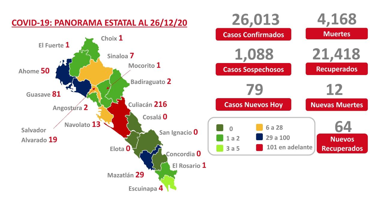 Los 12 nuevos fallecimientos Culiacán reporta 4, Ahome 3, Guasave 3, Mocorito 1, Salvador Alvarado 1.