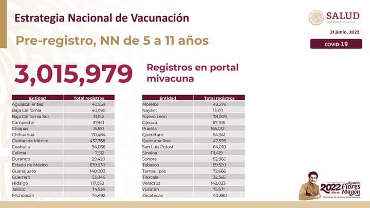 “Celebramos la respuesta positiva al registro de niñas y niños de 5 a 11 años para la vacunación contra #COVID19; 3 millones 15 mil 979 menores fueron apuntados en https://mivacuna.salud.gob.mx/ desde el 16 de junio”, indicó en sus redes sociales.