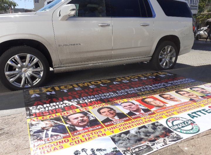 Los manifestantes le colocaron a pie del vehículo oficial del alcalde Jesús Estrada Ferreiro una manta con las imágenes de los presidentes municipales de Culiacán que fungieron desde 2004 a la fecha.