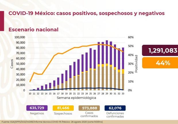 CIUDAD DE MÉXICO.- A dos días de llegar a los seis meses de epidemia, México acumuló esta noche 62 mil 076 muertes a causa del coronavirus y 573 mil 888 contagios, informó la Secretaría de Salud.