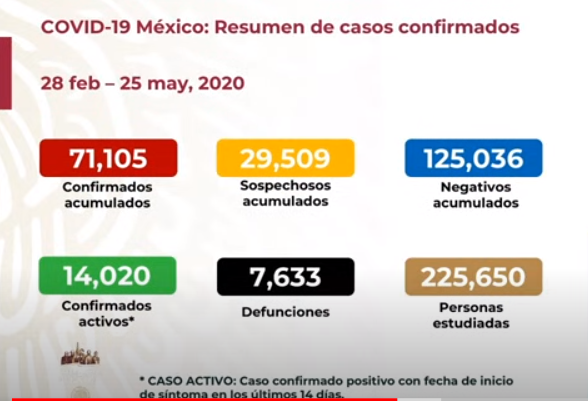 CIUDAD DE MÉXICO.- La Secretaría de Salud informó en su conferencia diaria que hasta este lunes se tienen registradas 7 mil 633 personas fallecidas y 71 mil 105 casos positivos de Covid-19 en el país; 239 muertos y 2 mil 485 casos nuevos en las últimas 24 horas