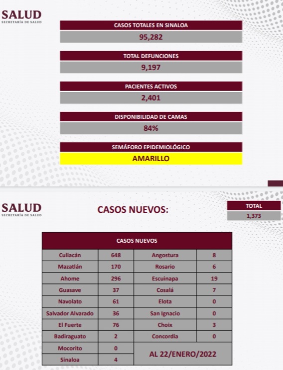 Suman 1,373 casos nuevos por COVID-19, y 2,401 casos activos acumulados por este mal, reportó la dependencia. Los casos sospechosos son 2,196 y un 84 por ciento de camas desocupadas.