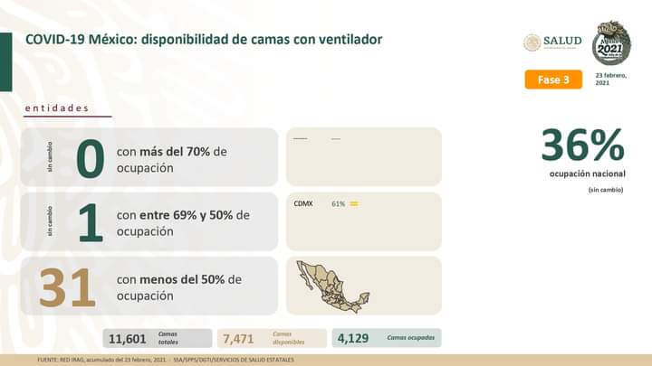A nivel nacional, 68% de camas de hospitalización general están disponibles y 32% ocupadas. En camas con ventiladores, 64% están disponibles y 36% ocupadas.
