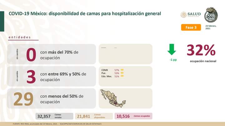 A nivel nacional, 68% de camas de hospitalización general están disponibles y 32% ocupadas. En camas con ventiladores, 64% están disponibles y 36% ocupadas.