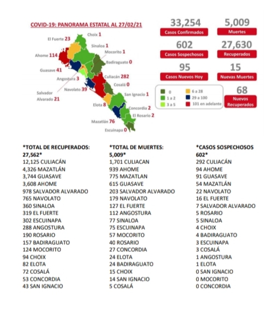 CULIACÁN, Sin.- Sinaloa superó este sábado las 5 mil muertes por COVID-19 con 15 nuevos fallecimientos reportados en las últimas 24 horas (Culiacán 3, Mazatlán 3, Guasave 3, Ahome 3