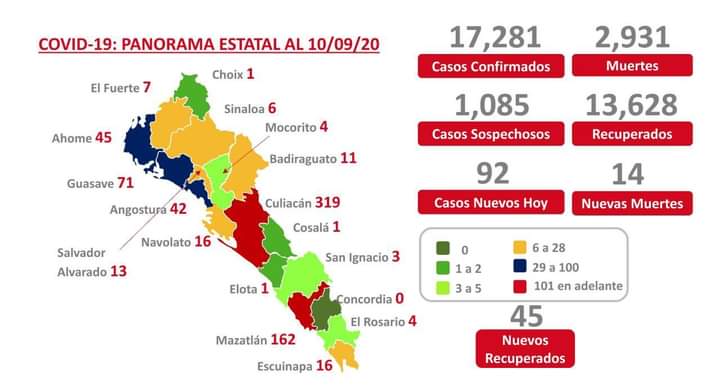 *Muertes*: 2,931 (14 nuevas. Mazatlán 7, Guasave 4, San Ignacio 1, Elota 1, Concordia 1)