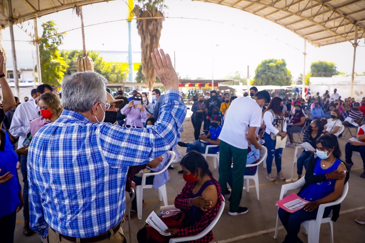 VILLA JUÁREZ, Sin.- El gobernador Rubén Rocha Moya, acompañado por la Secretaria de las Mujeres, Tere Guerra Ochoa y la presidenta del DIF Estatal Eneyda Rocha Ruiz visitaron la sindicatura de Villa Juárez, Navolato donde se llevó a cabo la vacunación para personal rezagado y los adolescentes mayores de 14 años de los campos agrícolas, en evento que se realizó en la Techumbre de Usos Múltiples de esta comunidad.