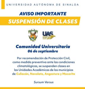 La suspensión de clases aplica para la Universidad Autónoma de Sinaloa, la mayor cada de estudios en el nivel medio superior y superior.