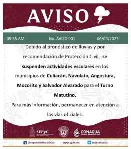 CULIACÁN, Sin.- Poe efectos de la tormenta tropical Jova se suspenden clases en los municipios de Culiacán, Navolato, Mocorito y Angostura.