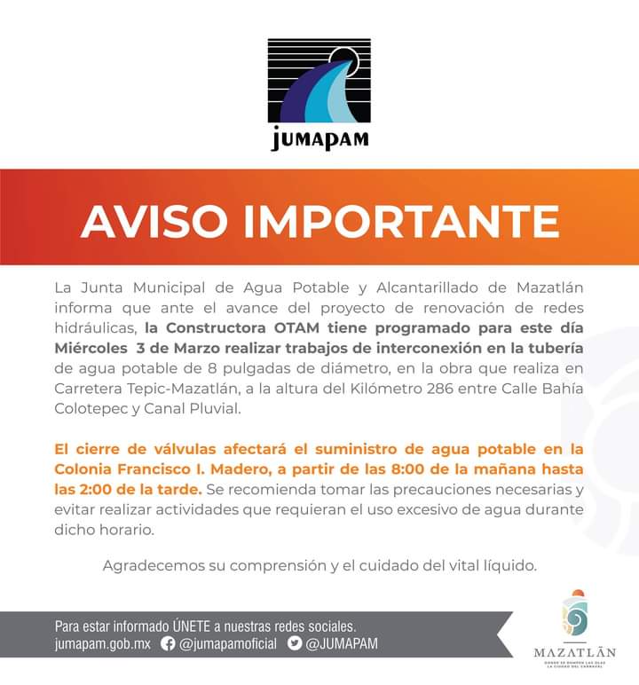 MAZATLÁN, Sin.- La Junta de Agua Potable y Alcantarillado de Mazatlán hizo del conocimiento de los vecinos de la colonia Francisco I. Madero que este miércoles 3 de marzo no contarán con el suministro de agua potable.