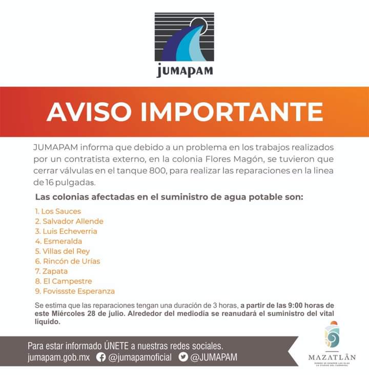 MAZ ATLÁN, Sin.- La Junta Municipal de Agua Potable y Alcantarillado de Mazatlán informó que debido a trabajos de reparación en la red de agua potable se suspenderá el servicio a 9 colonias del puerto.