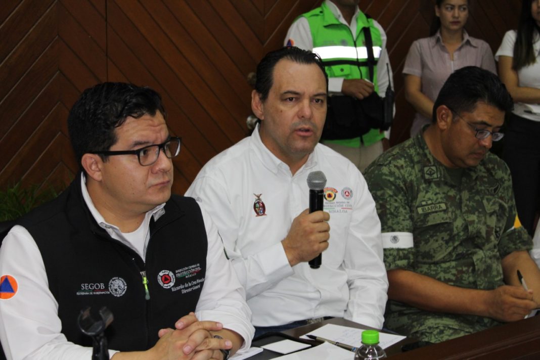 Ricardo de la Cruz Musalem, Director General de Protección Civil de la Secretaría de Gobernación, acompañado del Director General del Instituto Estatal de Protección Civil de Sinaloa, Juan Francisco Vega Meza, informó de las medidas al terminó de la reunión del Consejo Municipal Protección Civil de Mazatlán que encabezó el Presidente José Joel Bouciéguez Lizárraga.
