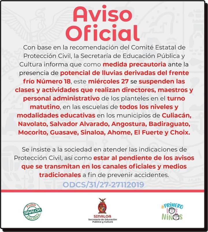 CULIACÁN, Sin.- La Secretaría de Educación Pública y Cultura anunció la suspensión de clases para el turno matutino en todas las modalidades y niveles para 11 municipios de Sinaloa.