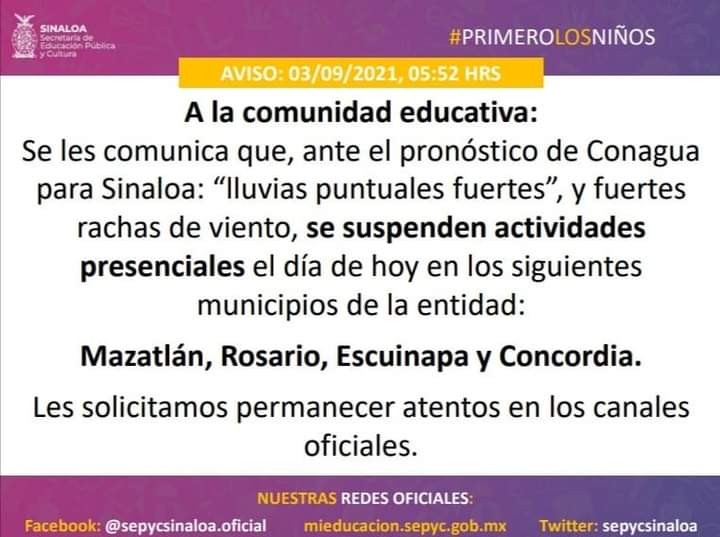 CULIACÁN, Sin.- Las clases presenciales fueron suspendidas este viernes en los municipios de Mazatlán, El Rosario, Concordia y Escuinapa debido a las fuertes lluvias en el sur del estado.