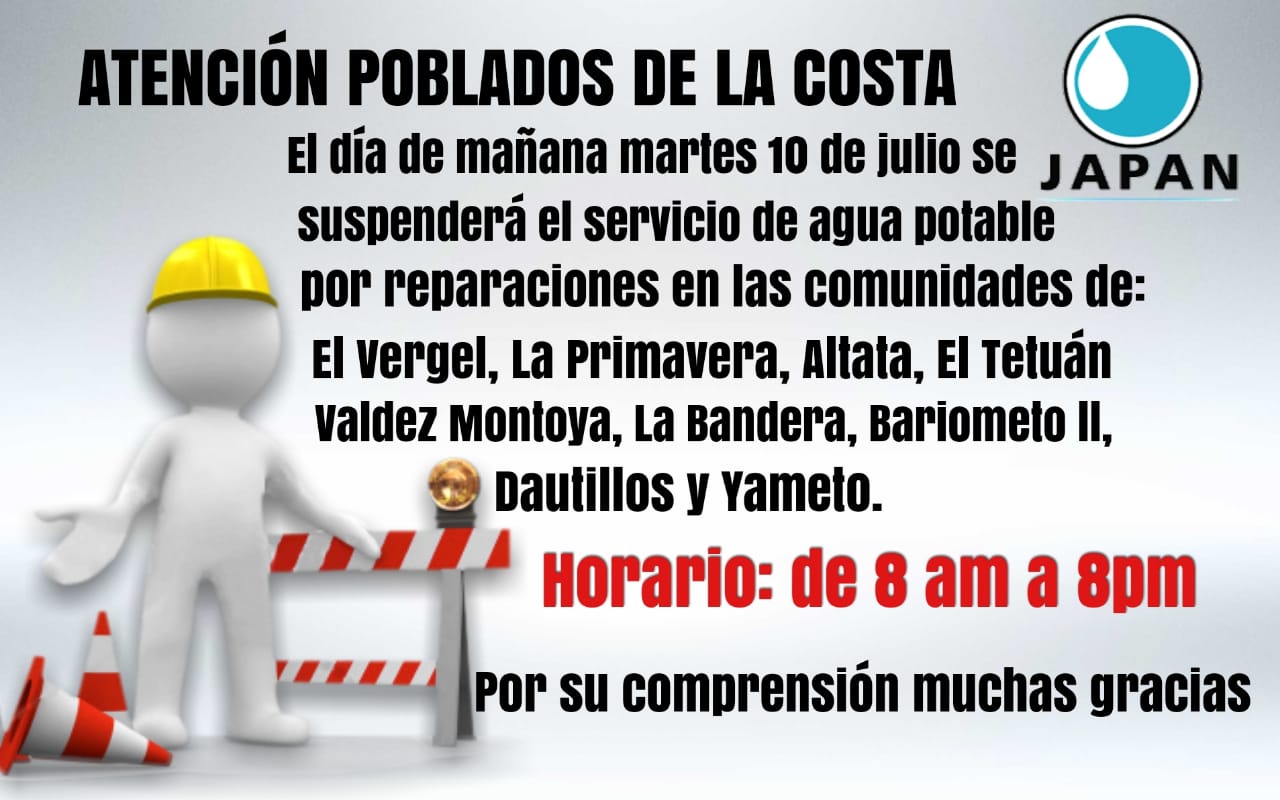 NAVOLATO, Sin.-La Junta de Agua Potable y Alcantarillado de Navolato suspenderá por 12 horas sus servicios de suministro de líquido en nueve localidades costeras por reparación de líneas de conducción en el puerto de Altata.