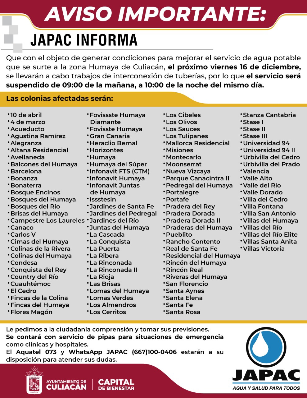 Las áreas afectadas serán Stase, Humaya, Infonavit Humaya, Fovissste Humaya, 10 de Abril, Villa Fontana, Colinas de la Rivera, Santa Fe, Canaco, Pradera Dorada, 4 de Marzo, Valencia, Barcelona, La Conquista, Cedros, Portalegre, Villas del Río, y sus colindantes.