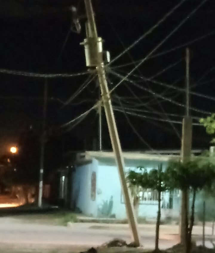 Pareciera que este poste, con un primer daño hace meses, se sostuviera con la sola tensión de los cables conectados en los cuatro puntos cardinales.