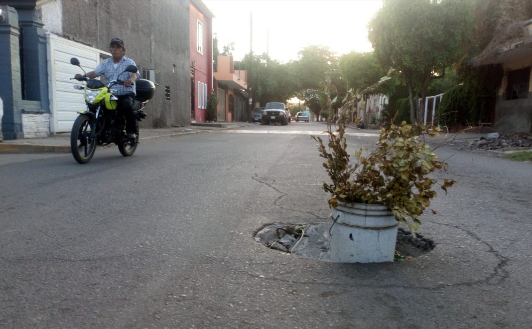 Vecinos de la calle Ignacio Zaragoza de la colonia Nayarit terminó siendo tapado con una cubeta plástica.
