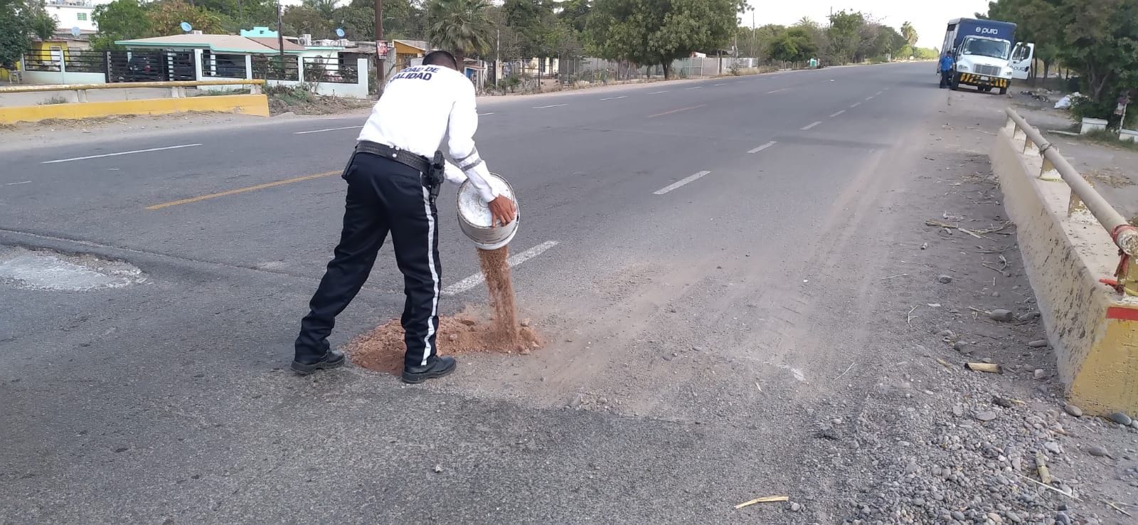 ELDORADO, Sin.- Este viernes elementos de la unidad de Vialidad y Tránsito de la Secretaría de Seguridad Pública municipal taparon baches con tierra en la carretera Culiacán-Eldorado.
