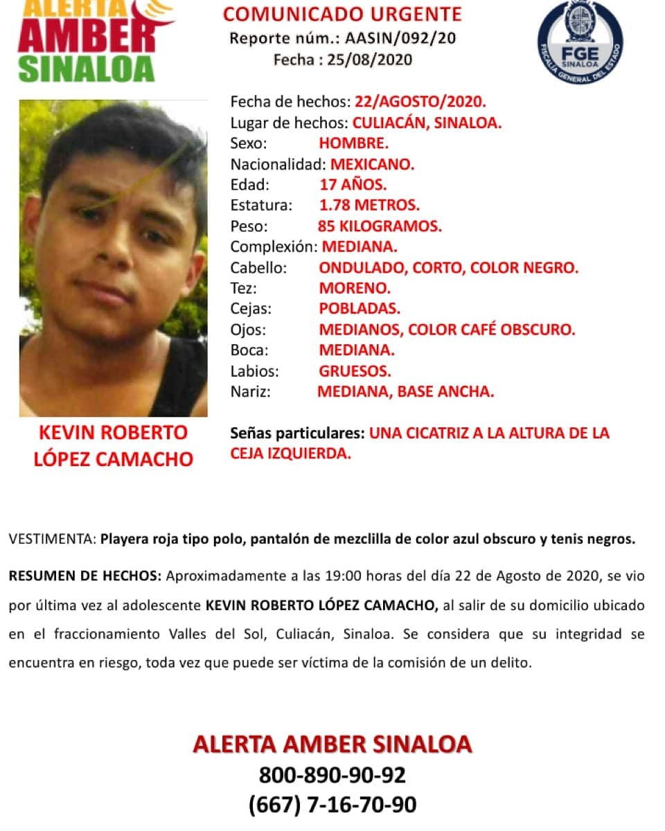 CULIACÁN, Sin.- Kevin Roberto López Camacho tiene 17 años de edad y desapareció el pasado 22 de agosto cuando salió de su domicilio.