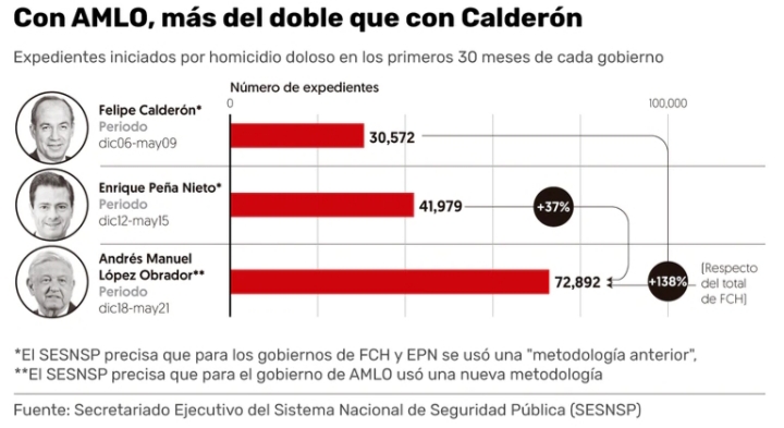 Esa cifra es muy superior a la registrada en los primeros 30 meses de los gobiernos de Felipe Calderón (diciembre de 2006 a mayo de 2009) y Enrique Peña Nieto (diciembre de 2012 a mayo de 2015).
