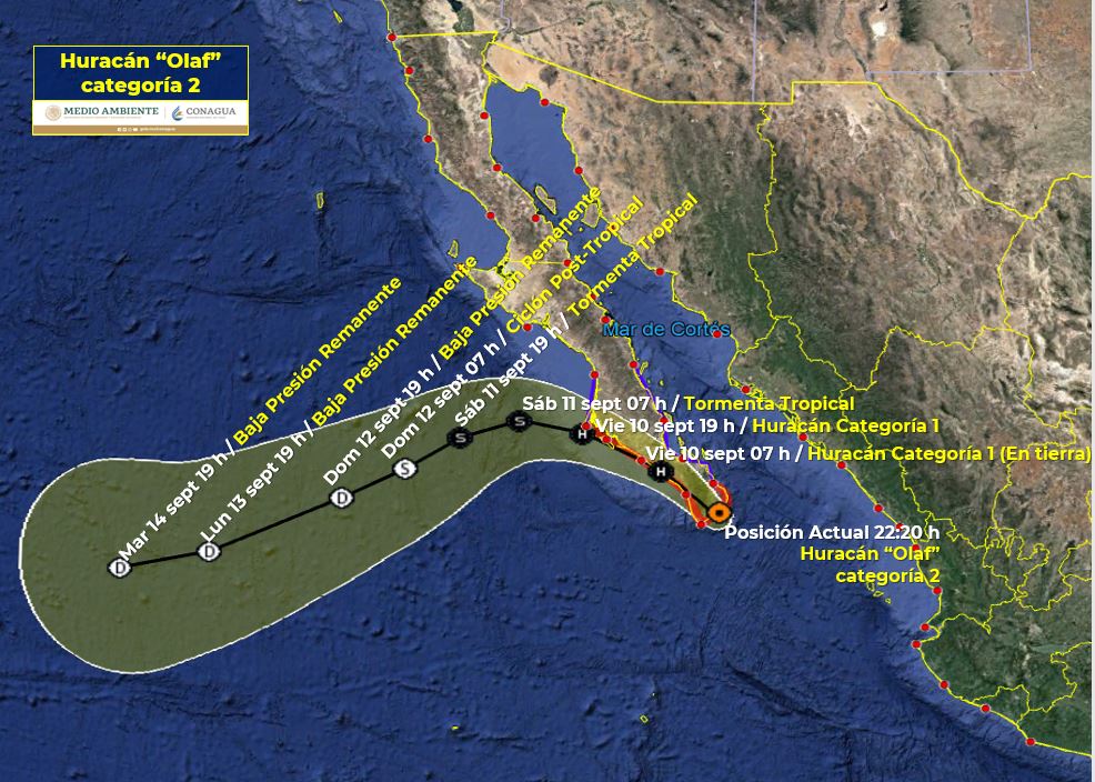 CIUDAD DE MÉXICO.- El centro del ojo del huracán “Olaf” de categoría 2 ingresó a tierra a las 22:00 horas (hora del centro de México) muy cerca de San José del Cabo, B.C.S.