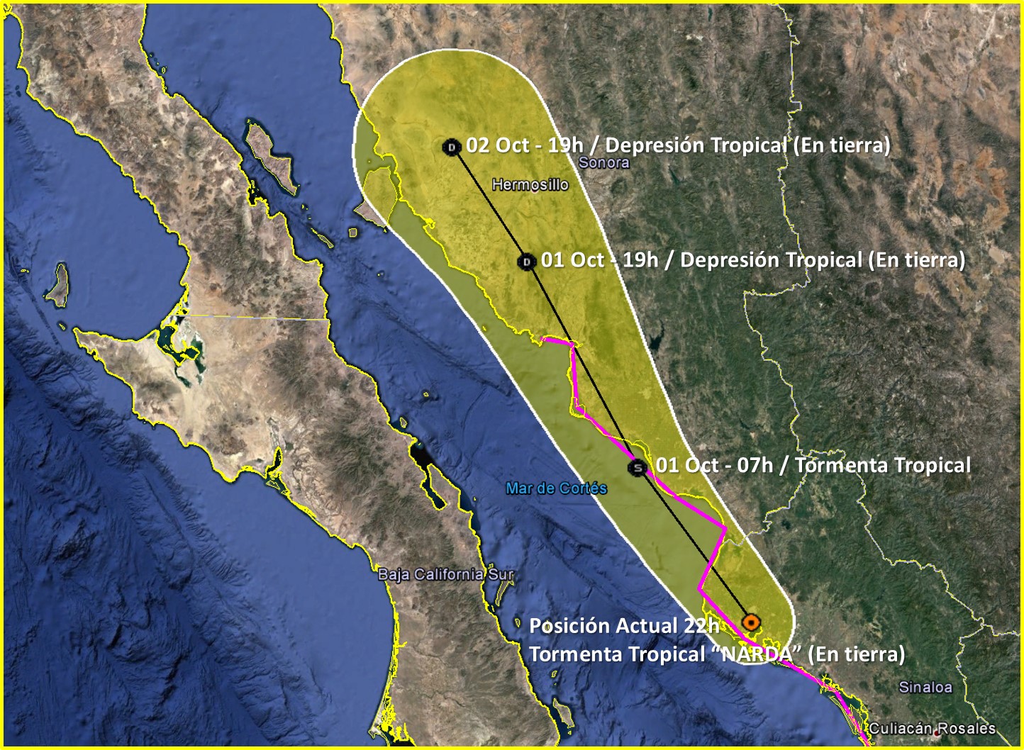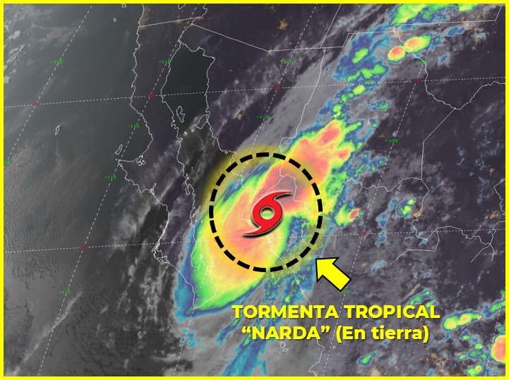CIUDAD DE MÉXICO.- Aproximadamente a las 20:30 horas del Pacífico norte el centro de la tormenta tropical “Narda“ impactó por segunda ocasión en el territorio mexicano, ahora lo hace en la costa norte de Sinaloa, a 35 km al sur de Los Mochis, en el municipio de Ahome, Sinaloa.