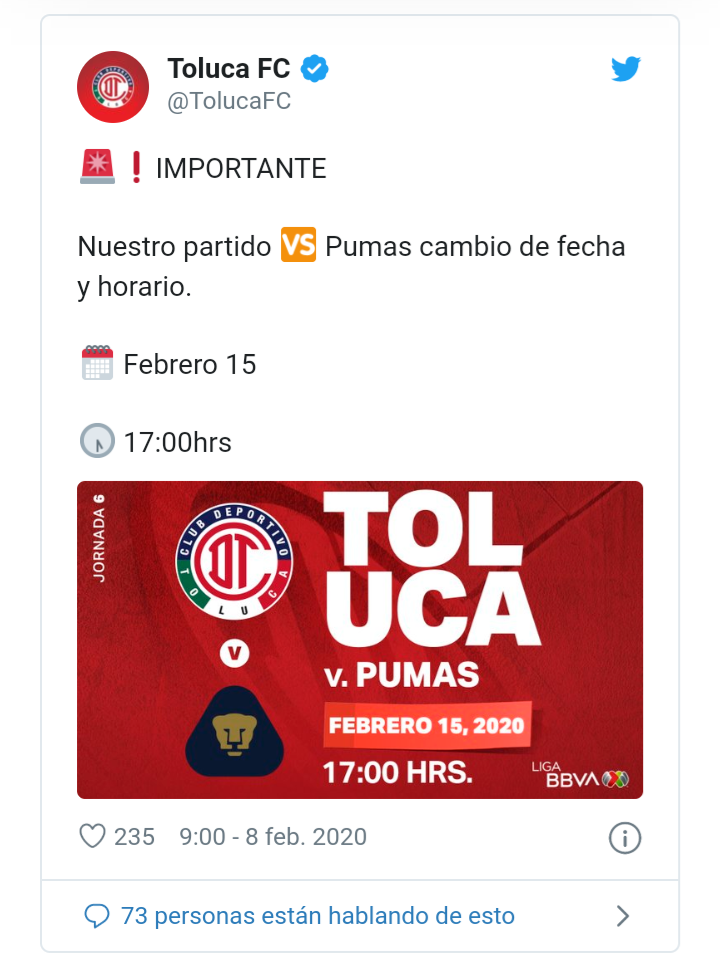 CIUDAD DE MÉXICO.- Los cambios de horarios siguen en la liga MX ya que ahora, el Club Toluca hizo oficial el cambio que tendrá el partido en el que reciban a Pumas, como parte de la Jornada 6 del torneo.