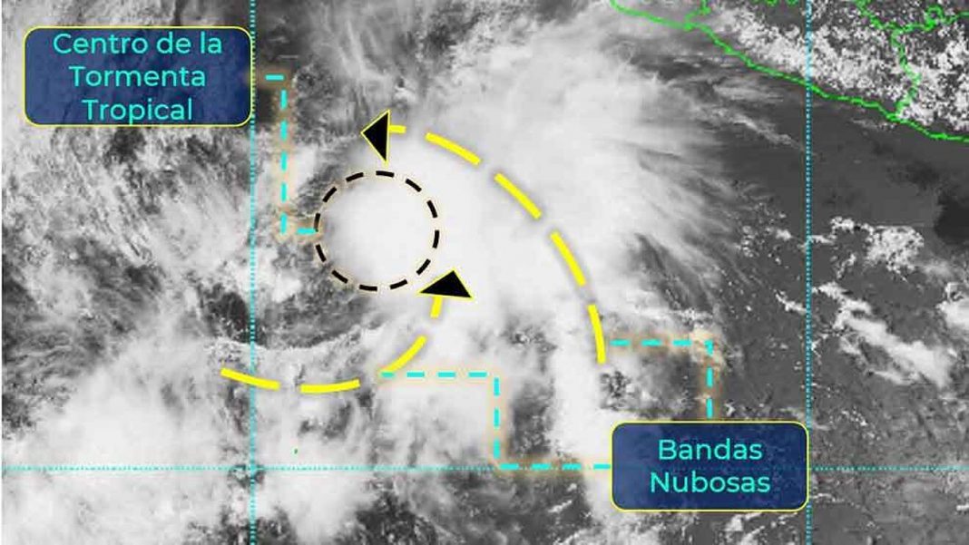 Presenta vientos máximos sostenidos de 65 kilómetros por hora con rachas de 85 kilómetros por hora y se desplaza hacia el noroeste a 7 kilómetros por hora. El sistema se encuentra lejos de la República Mexicana, sin embargo, su circulación mantendrá el ingreso de humedad con lluvias fuertes, acompañadas de descargas eléctricas, sobre el occidente del país.