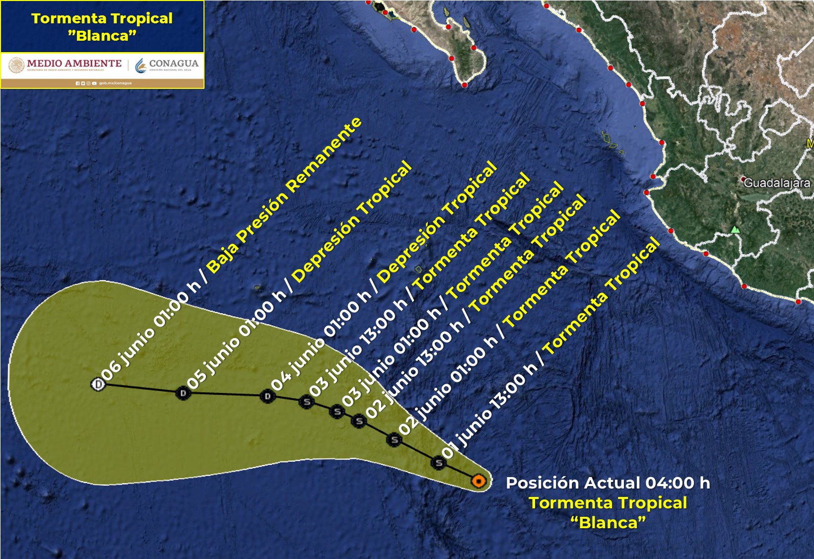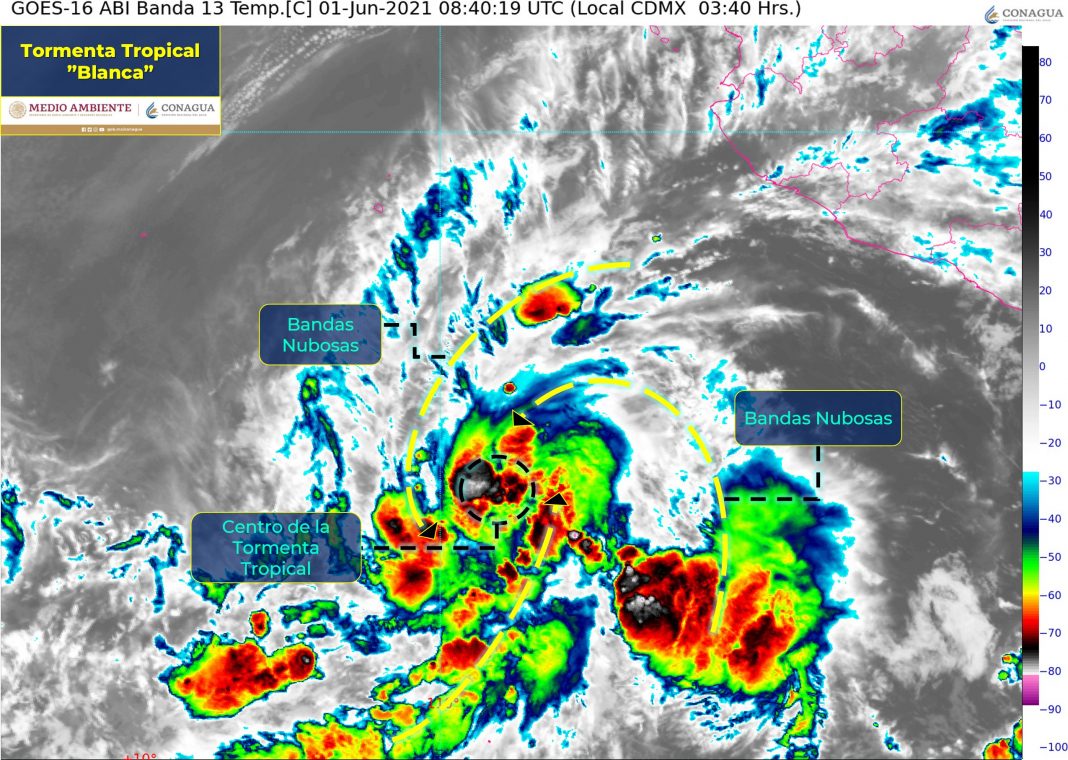 CIUDAD DE MÉXICO.- El centro de la Tormenta Tropical “Blanca” se localiza al sur de la Península de Baja California.