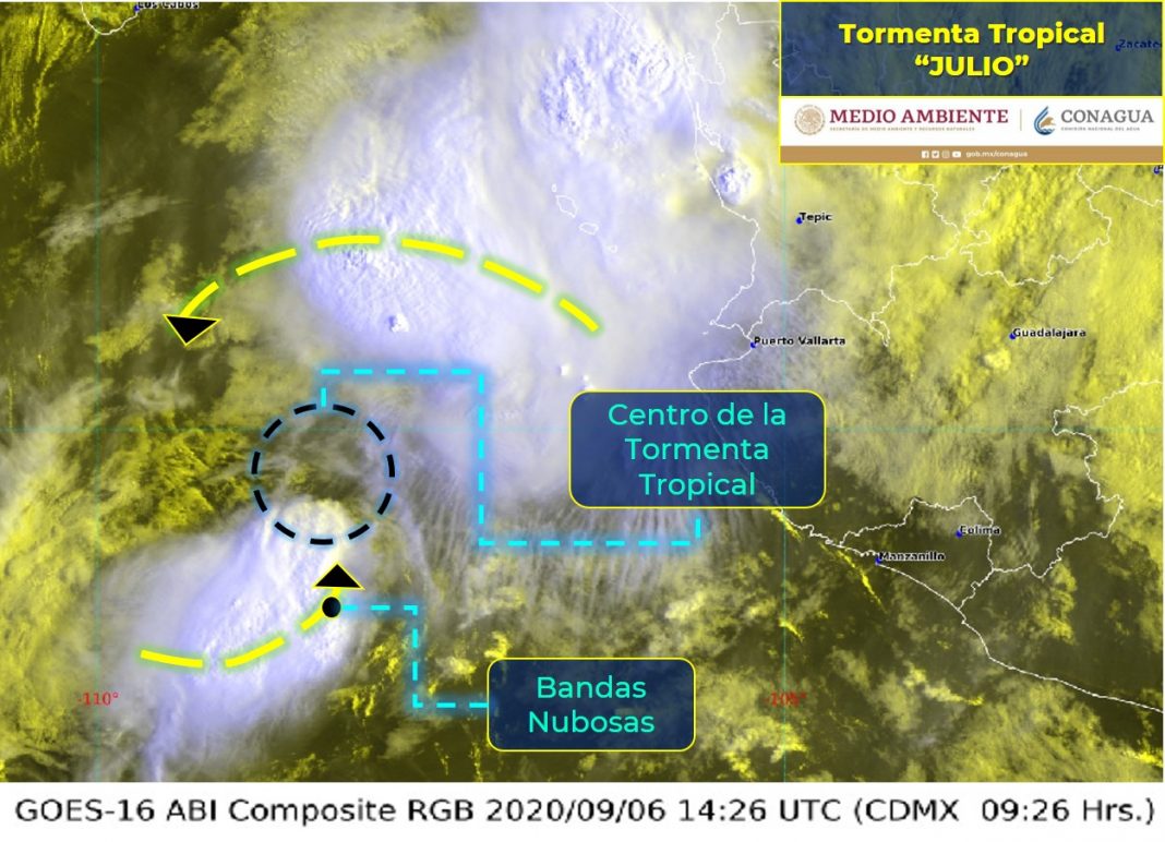 El centro de la tormenta tropical “Julio” se localiza al suroeste de las costas de Jalisco. Produce lluvias intensas en Nayarit y Jalisco, así como olas de 1 a 3 metros en las costas de esas regiones. Se mantiene en vigilancia.